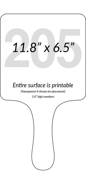 The Swann Auction Galleries shaped paddle is a true 6.5" square with radiused corners and a longer 5.3" long handle. A 2.8" high number fits nicely here. Remember you can choose your number color (and number outline color) for ANY of our paddles at no additional cost to you.