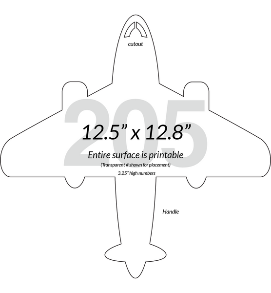Our Jet Airplane shaped paddle is (as all our shapes) a 1-piece paddle and available in all of our plastics we use. With cutouts for the cabin windows this shape uses the body of the fuselage as the handle for the paddle. Larger 3.25" high numbers fit on this one. Remember you can choose your number color (and number outline color) for ANY of our paddles at no additional cost to you.