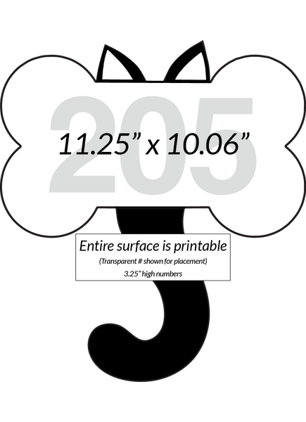 So what is a "Cat-Bone" shaped auction paddle? We're not really sure ourselves, but a customer wanted it produced so we made it! Cat ears, a dog bone, and a cat's tail finish out this shape. The tail becomes the handle here, and we can tweak the shape and print in any way you like. 3.25" high numbers in your choice of color. If you want the printed image select 'numbers and graphics' when you order.