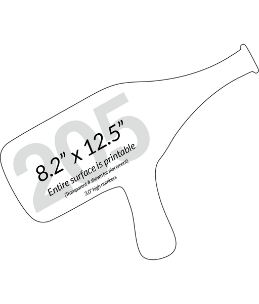 This is our regular sized Wine Bottle shaped auction paddle. It sports a 3.0" high number along the length of the bottle available in any color you wish for the same cost. We also have a larger Wine Bottle as well in our shape collection. We have a couple of different styles so be sure to check them all out.