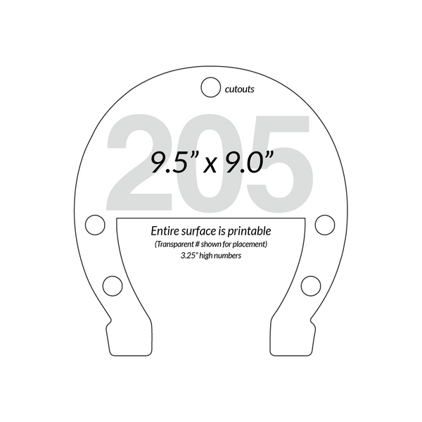 We have 2 different styles of a Horseshoe Shape bidder paddle. On these 2 shapes there is no "handle" to speak of; rather the paddle is as you see it with either side of the paddle being the hand grip. There are also several "nail hole" cutouts for where the nail spikes would go. Large 3.25" high numbers on this one.