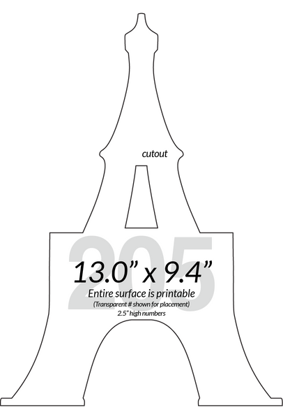 Here is our Eiffel Tower shaped auction paddle for that French-inspired theme you may be having. 2.5" high numbers come standard here and it has a cutout separating the sides of the structure. No handle needed for this one as one can easily hold either side of the base. If you need it to fit into a 9" wide envelope we can make it slightly smaller too if you like. We have complete flexibility!