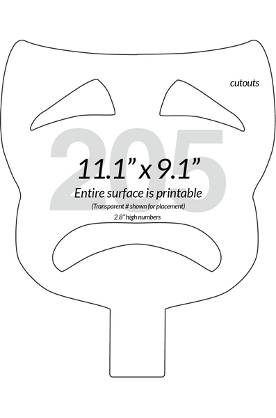 This is our "Tragedy" Mask shaped auction paddle. With lots of design elements including cutouts for the face elements, it holds a 2.8" high number. Often this shape is paired up with the "Comedy" Mask shape, so like a split of 1/2 of each shape to make up your paddle set. Or whatever you like.