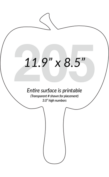 See our Apple shaped auction paddle here. 3.0" high numbers and full color digital printed. As always, you have your choice of any number color, both the fill and the border color, at no additional cost to you. Just specify what you want in the notes section on the product order page.