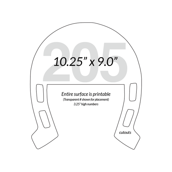 We have 2 different styles of a Horseshoe Shape bidder paddles. On these 2 shapes there is no "handle" to speak of; rather the paddle is as you see it with either side of the paddle being the hand grip. There are also several "nail hole" cutouts for where the nail spikes would go. Large 3.25" high numbers on this one.
