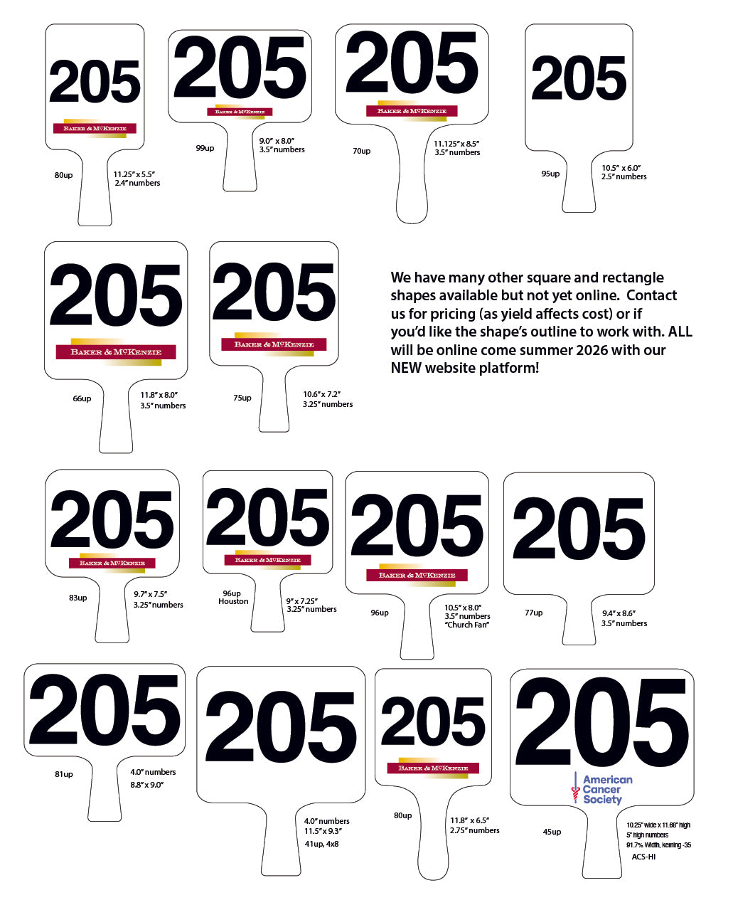 One of our smallest auction paddles, this 'tweaked' version of our regular vertical rectangle shape has a few more curves to it. With the same overall dimensions and the same 2.5" high numbers as its more conservative sister, there is still plenty of extra space for sponsor graphics or your organization's logo. Also, remember you can choose your number color (and number outline color) for ANY of our paddles at no additional cost to you.