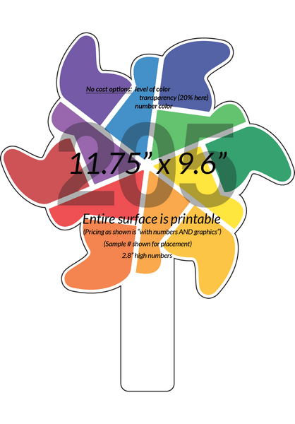 Our Pinwheel shape paddle can be configured a number of ways including with or without the colors shown here. You can also order with or without the numbers too; or even just blank paddles. The numbers are 2.8" high here. We can change the level of color transparency to change the look/number contrast as well; no problem. As shown, pricing would be based upon "with numbers AND graphics" on the product page. Of course they can be made on any of our plastics as well as 2-sided.