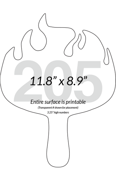 Here is our Flame-shaped paddle. Popular with Fire Department Associations and backelor/bachelorette auctions if you can believe it. 3.25" high numbers with all the usual customization options.
