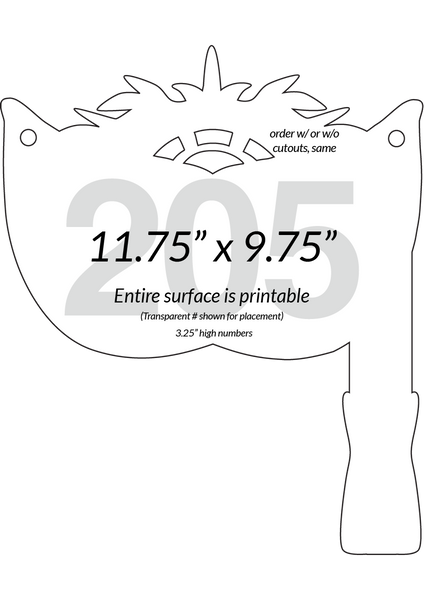 This is our Masquerade Ball (Venetian) Mask shaped auction paddle. With lots of design elements including cutouts and feathers, it holds a 3.25" high number. Without the cutout design elements we can also go up to a 3.5" high number. No difference in price, of course. A perfect paddle for your "masquerade" theme with a very professional look and feel.