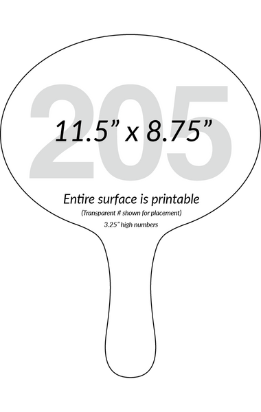 This is our most popular shape! The Oval! Nice large 3.25" high numbers in Helvetica Bold font so they are easy to be seen. Price out the best options for your reusable plastic auction paddles here at Better Bidders. Select your material (1 of 5) and your printing options (or just blank paddles) and turnaround time!
